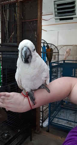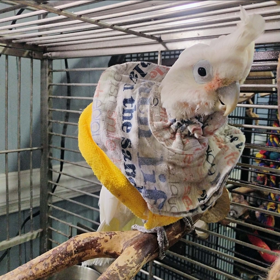 Murdock is a Goffin Cockatoo who joined Nana & Papa’s Nest in 2024. His exact age is unknown, and his story is one of many homes—our rescue is his fifth. His previous home was involved in a fire caused by the owner’s actions, and when Murdock arrived, he was suffering from a chest wound and had begun to self-mutilate due to over-preening.